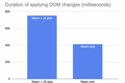 The duration to apply the DOM changes dropped by 45% when we were able to remove JS glue code. DOM operations can already be expensive; WebAssembly users can’t afford to pay a 2x performance tax on top of that. And as this experiment shows, it is possible to remove the overhead.